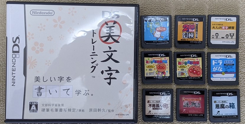 - Logiciels éducatifs : il s’agit principalement des logiciels pour apprendre les kanjis, mais aussi les titres contenant des quizz afin de s’exercer de façon “sérieuse”. Exemples : Kanken DS, Ds Bimoji Training…