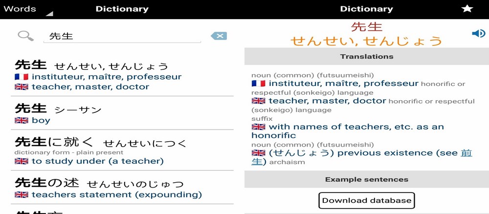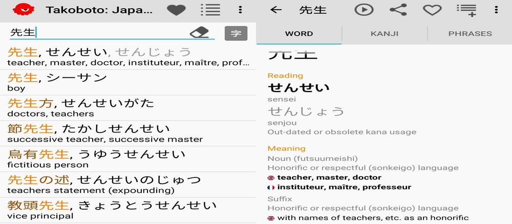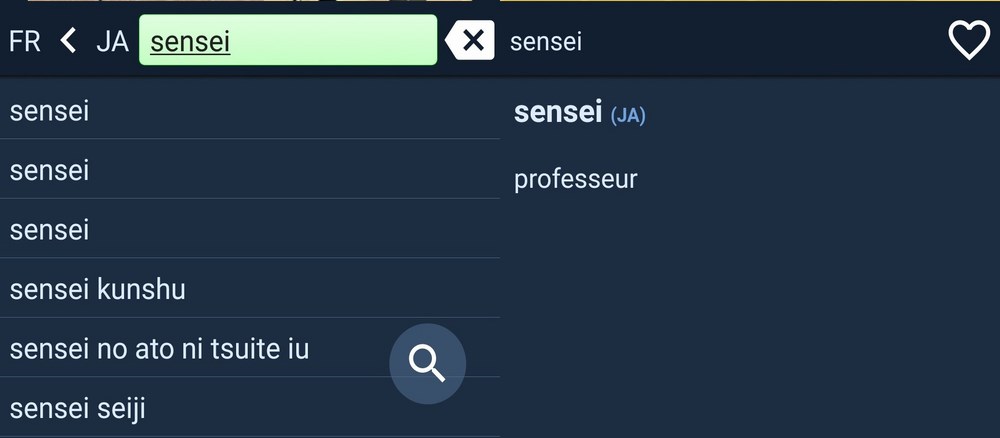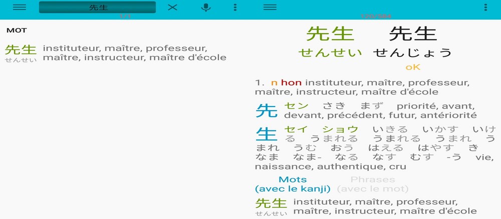 Alors pour toutes les applications, j’ai décidé de faire un test avec le mot 先生. On peut aussi faire une recherche depuis un mot français mais ce n’est pas fait pour. En effet, il n’y a pas d’entrée à proprement dite en français. Donc par exemple, si vous recherchez le mot “poids”, on vous donnera la liste de toutes les entrées japonaises contenant le mot “poids”. C’est le même problème donc qu’avec le dictionnaire en ligne dictionnaire-japonais par exemple. Bref, voici ce qu’on obtient donc avec 先生 :