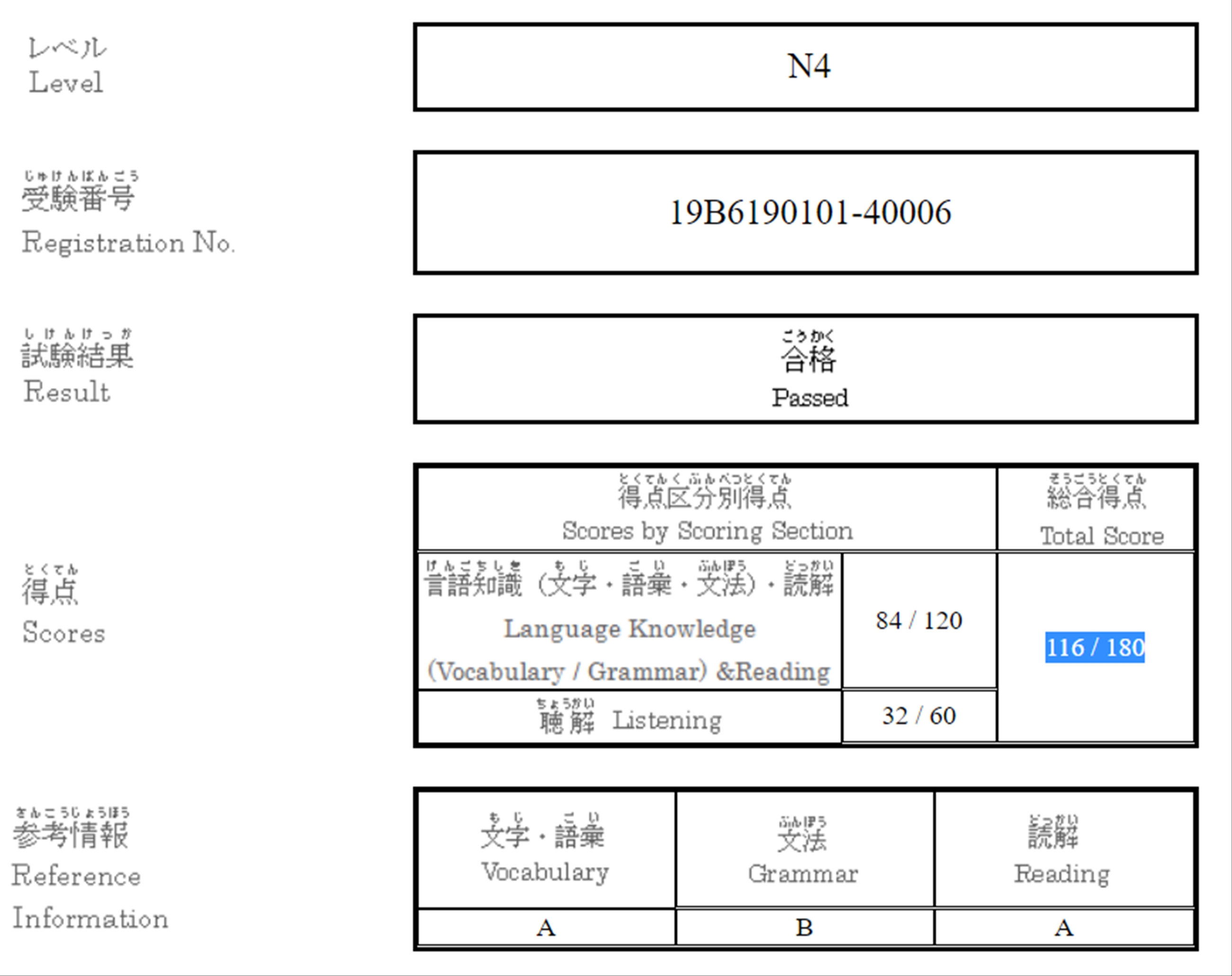Oui, tu as réussi l'examen (je crois que le score total minimal est de 90/180 points pour le N4).